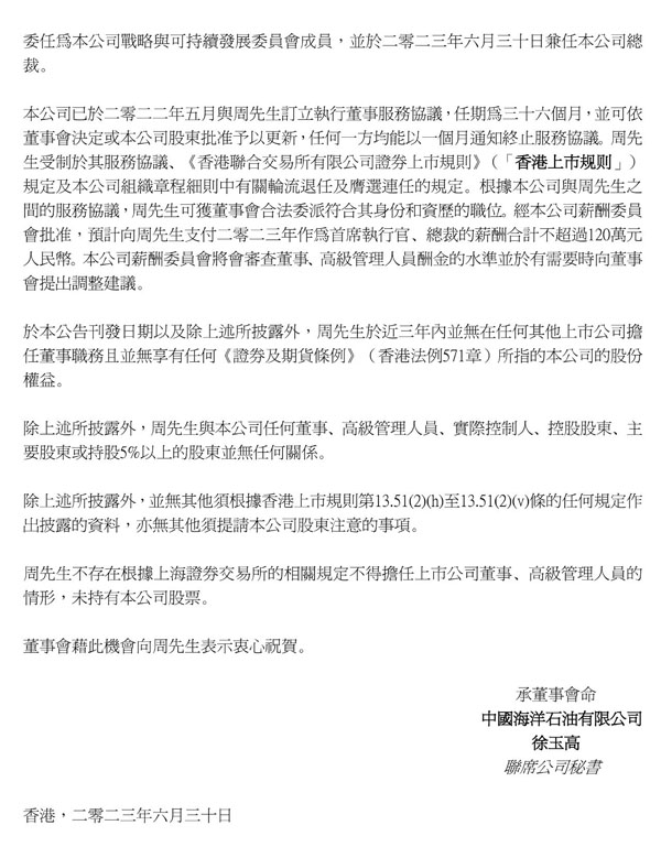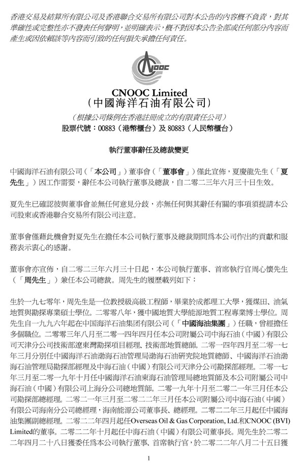 6月30日,中國海洋石油宣布,夏慶龍因工作需要,辭任公司執行董事及總裁,自今日生效。公司執行董事、首席執行官周心懷兼任公司總裁。